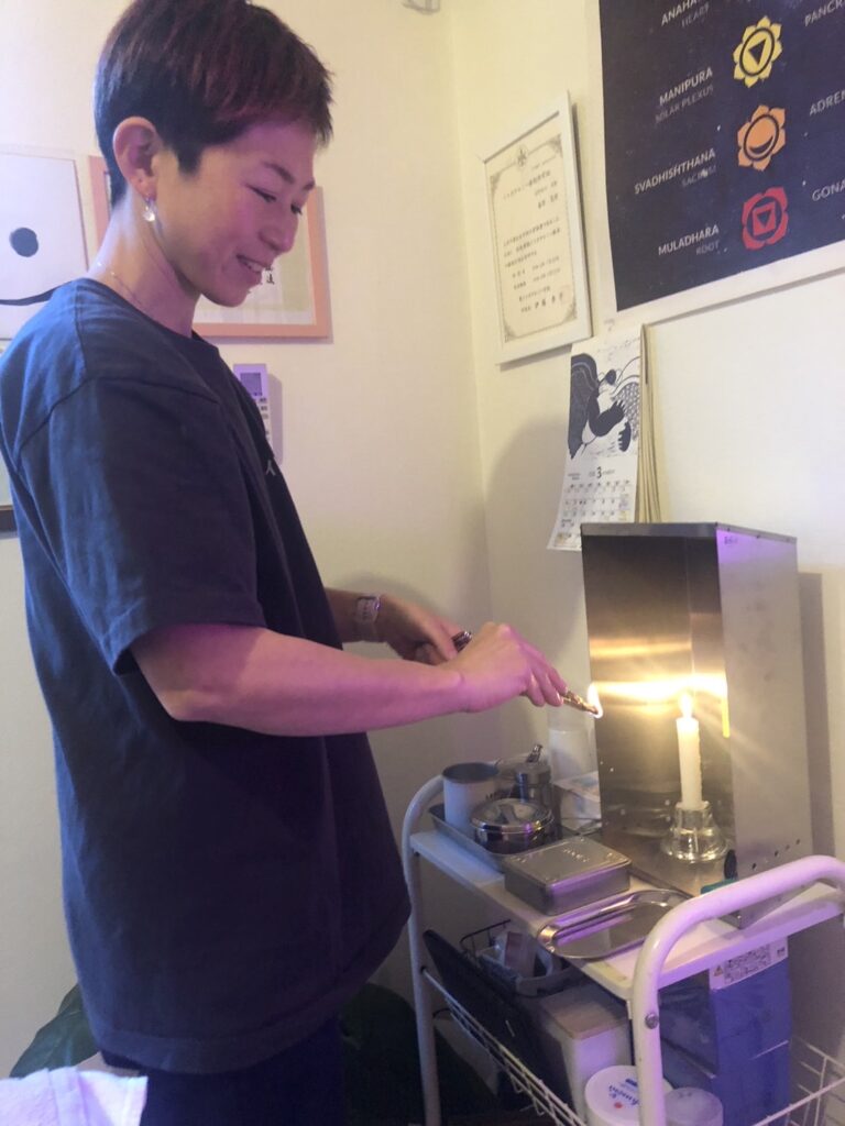 初めて体験したときのぬくもり、香り、身体がゆるみ喜ぶ感覚に深く感動し、家庭で家族にかけられる「家庭健康療法イトオテルミー」を学び、療術師として活動を開始。